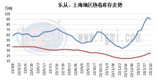 但細(xì)分區(qū)域來看,熱卷市場社會(huì)庫存總量分布較為集中,主要增量來源來自河北唐山、黃驊等部分區(qū)域以及樂從區(qū)域,相對而言,作為熱卷主要消耗地區(qū)的華東市場社會(huì)庫存依然處于正常范圍。而后期隨著需求端緩慢恢復(fù),熱卷市場資源消化情況加快,社會(huì)庫存累庫不平衡的局面也將得到有效改善。特別是本周以來,樂從高位庫存已經(jīng)開始松動(dòng),截止到2月10日,樂從區(qū)域社會(huì)庫存量為95.04萬噸,較上周小幅下降2.94萬噸。