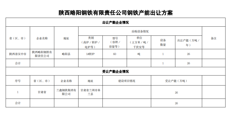 陜西略陽(yáng)鋼鐵產(chǎn)能置換方案和產(chǎn)能出讓方案公告
